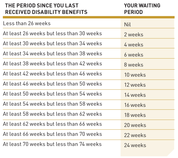 Your waiting period is two weeks for each four-week period in excess of 26 weeks since your disability benefits ended. For example, if it has been 29 weeks since your last disability payment (three weeks in excess of 26), your waiting period is two weeks, as summarized in the following table.